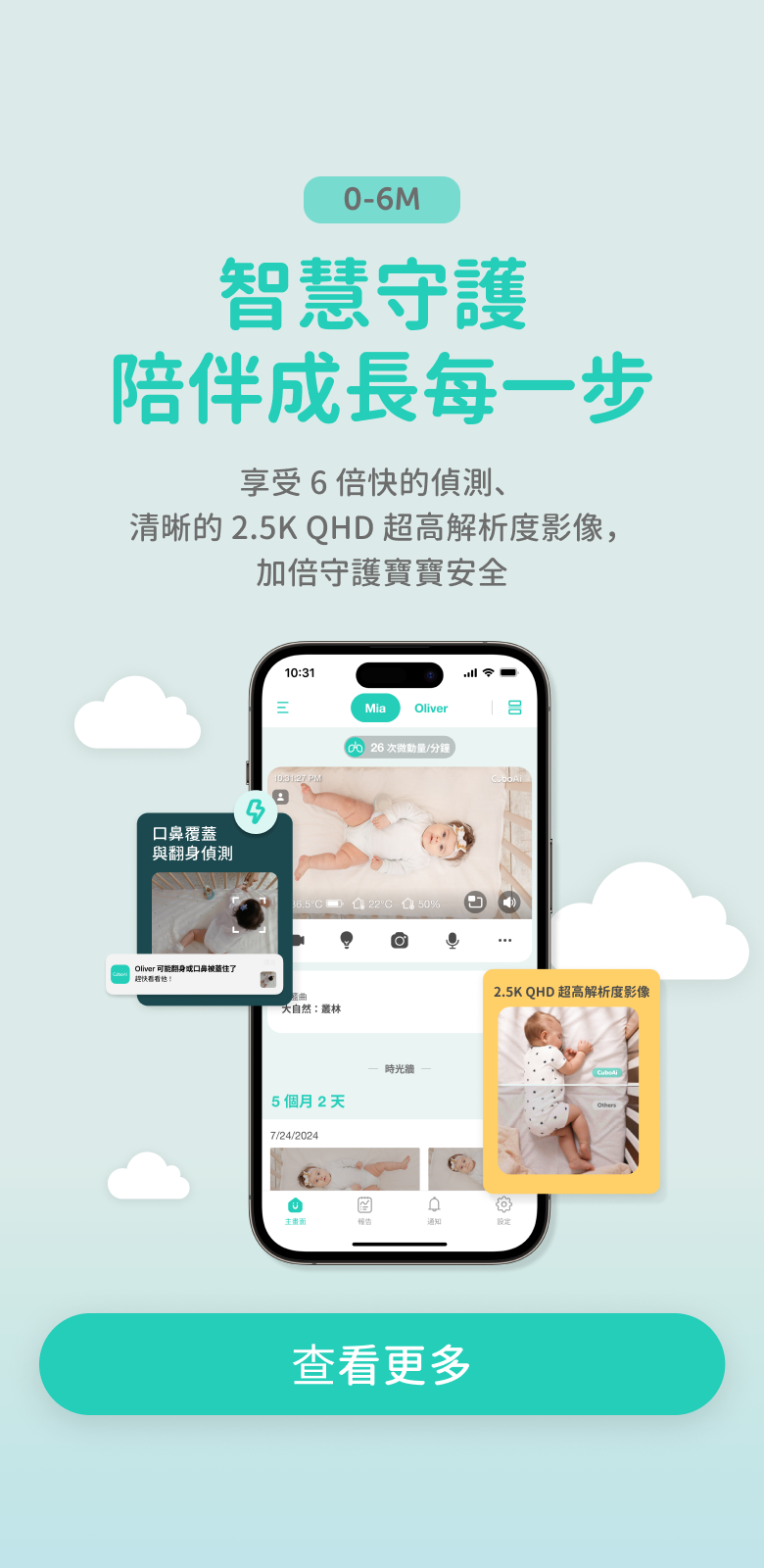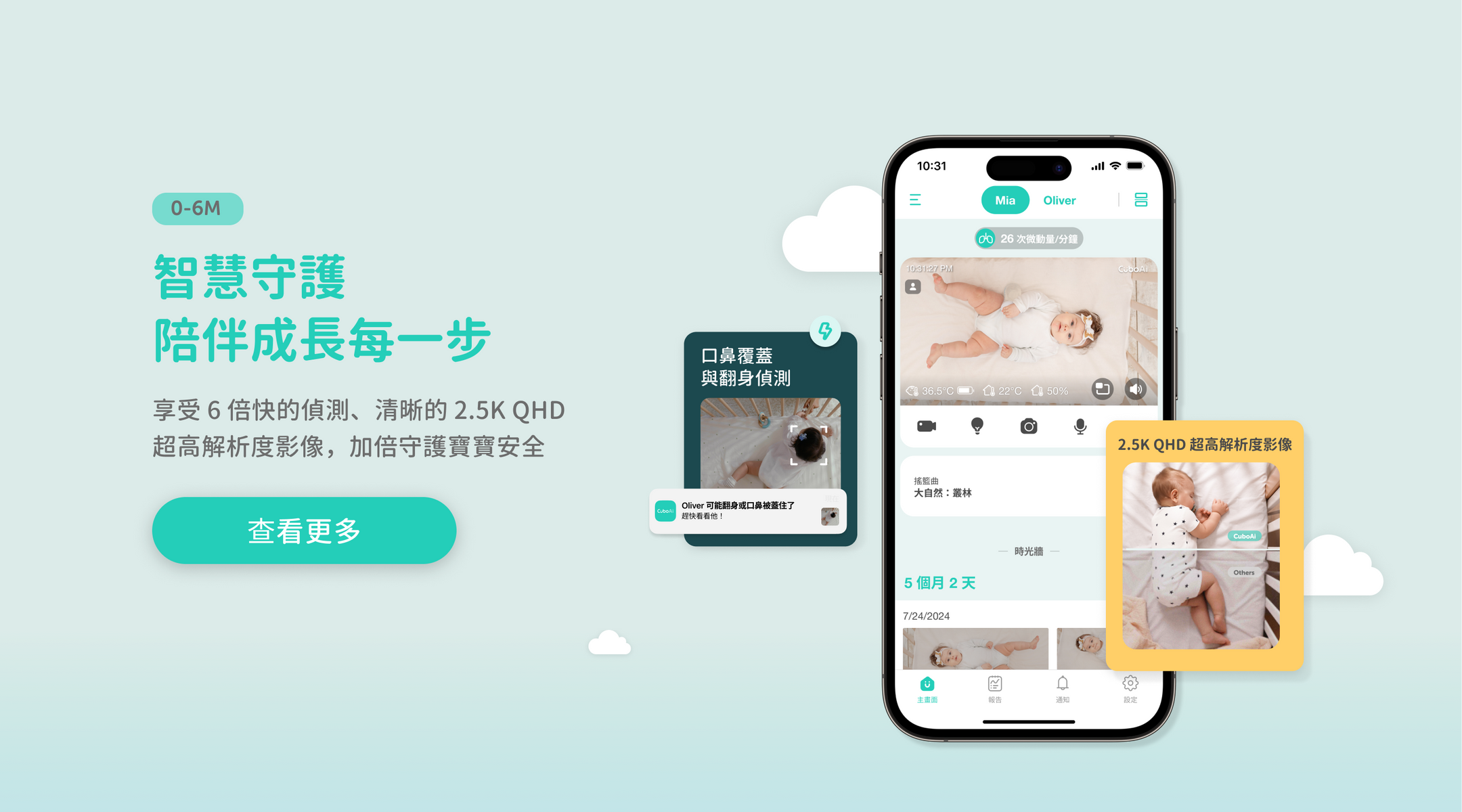 搭載 2.5K QHD 超高解析度鏡頭,發送即時的口鼻覆蓋與翻身通知 |